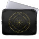 Cycles laptop sleeves. Cycles is a Germanic design created by Anna M. Asbury and consists of a black background with an Aegishjalmr in the center and encircled by Elder Futhark Runes. The design is enclosed in a diamond with the Ingwaz Rune, flanked on all four sides with a bind rune, and encircled by the Jera and Ingwaz Runes.