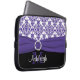 Esta bolsa de laptop preta e roxa personalizada do damasco com um broche da fita e da jóia do FALSO tem as caixas de texto para você personalizar com seu próprio nome, iniciais, nome da empresa, ou o outro texto. Se você precisa alguma ajuda que personaliza, envie por correio electrónico por favor niteowlstudio@gmail.com.