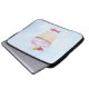 Uma bolsa de laptop personalizada com uma ilustração de um cupcake delicioso com espirais cor-de-rosa e uma baga com folhas aninhadas no glacé. Colocado sobre um fundo de aquarela azul claro.