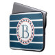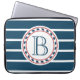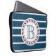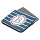 Design de temas náuticos com decoração em forma de monograma em forma redonda sobre fundo listrado a azul e a branco