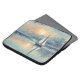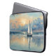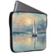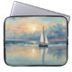 Um veleiro desliza através de um mar calmo com um belo pôr do sol lançando matizes quentes através do céu e da água.