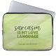 Vestir seu dispositivo com esta bolsa de laptop verde moderna. Ele apresenta um fundo abstrato verde e o seguinte texto: "Sarcasmo é minha língua de amor." Também há espaço para texto personalizado na parte inferior, como um nome, ou ele pode ser excluído.