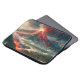 Uma majestosa erupção vulcânica domina a cena, com lava vermelha vibrante fluindo pelas encostas e uma pluma de fumaça soprando para o céu. A paisagem circundante está repleta de verde, contrastando a erupção feroz.