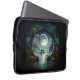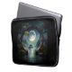 Uma bolsa de laptop com uma paisagem fantástica de uma lua de cheio, arco circular, lago e montanhas.