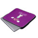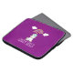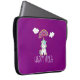 Uma bolsa de laptop com uma bela ilustração de um unicórnio branco sentado no seu rabo sorrindo e parecendo feliz. Nuvens sorridentes e um arco-íris. Texto diz: Feliz Víblias. Imagem de uplifting adorável. Com um fundo de aquarela púrpura rosado.