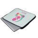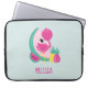 Bolsa de laptop com uma ilustração fofinha de um flamingo cor-de-rosa com algumas melancias e abacaxis. Esquema de cor rosa e verde. Sumério e tropical. O fundo é uma cor verde pálida com bolinhas brancas.