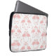 Este saco de laptop tem um padrão fofo de dois flamingos virados um para o outro, com um coração cor-de-rosa no meio. Penas cor-de-rosa se esgueirando ao redor delas. As imagens são colocadas sobre um fundo branco.