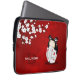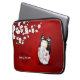 Uma boneca de kokeshi num Kimono branco com borboletas vermelhas. A japonesa fica debaixo de uma flor branca de cereja, o fundo é vermelho. Personalize esta bolsa de laptop de arte japonesa para ela com seu nome e monograma.