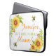 Uma elegante Bolsa de laptop de girassol amarelo rústico personalizada com a citação "Vida ao vivo no cheio floral!" que inclui um fundo branco decorado com um girassol amarelo floral bonito com uma abelha e um fio de luz. Faz uma adorável aposentadoria, saindo, aniversário, Natal ou presente de dia de as mães Personalizar com um nome. A cotação pode ser alterada se necessário.