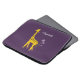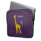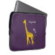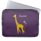 Bolsa de laptop de girafa roxa personalizada para uma menina com uma girafa giratória girando sobre uma flor violeta e segurando algumas flores com a cauda enquanto patinava com skates roliças que são feitas de flores, sobre fundo roxo escuro. Esta bolsa de laptop personalizada e fofa vai fazer um presente de excelente para alguém que ama girafas, animais de desenho animado e ilustrações bonitas.
