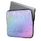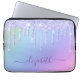 Capa de ipad personalizada de cinza com brilho púrpura esparso pálido descendo sobre um fundo arco-íris cor-de-rosa, roxo, azul e verde. Personalize com seu primeiro nome em um script roxo de tendência na moda com baloiços.