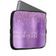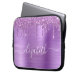 Bolsa de laptop cônica e cãozinha monogramada, com gotas de brilho púrpura em um fundo metálico roxo e esfregado. Personalize com seu nome em um roteiro branco de tendência de na moda com baloiços.