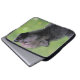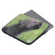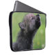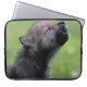 Fotografia de um adorável filhote de lobo negro uivando na grama.