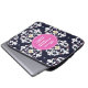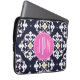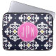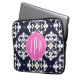 Um presente que pode ser personalizado com seu círculo dentro cor-de-rosa monograma no centro. O plano de fundo é azul marinho e o padrão branco do ikat.