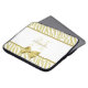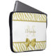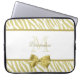 Uma Bolsa de laptop glamourosa de 15 polegadas para mulheres com padrão de zebra branco e ouro e uma fita de ouro elegante amarrada em um arco giro. Personalize este cobrir de dispositivo móvel de impressão digital e na moda, adicionando seu nome e as iniciais com monogramas. Imagem impressa plana, não fita real.