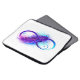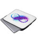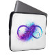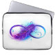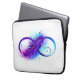 Símbolo infinito com uma bela pena pintada em cores roxas e azuis brilhantes sobre fundo branco.