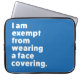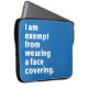 Muitas pessoas estão vestindo máscaras faciais e outros revestimentos para se proteger da COVID-19 e infecções semelhantes; em algumas partes do mundo, há um requisito legal para vestir em certas áreas. No entanto, nem todos podem vestir uma máscara. Algumas pessoas estão isentas por razões de saúde ou outras. Muitas vezes, as crianças beneficiam de isenções. Pessoas com asma, dificuldades respiratórias, ansiedade e muitas outras doenças são também aconselhadas a não vestir máscaras faciais. Esta design pretende tornar isto claro para todos à vossa volta. O texto diz claramente "estou isento de vestir uma cobertura de rosto".