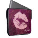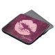 Uma bolsa de laptop com lábios brilhantes cor-de-falso rosa-tenra. O fundo é um padrão cor-de-rosa avermelhado escuro com folhas tropicais de palma.