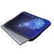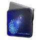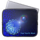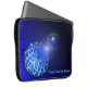 Uma imagem fractal, azul, ligeiramente modificada, que parece ser um cilindro oco aberto ao vácuo do espaço numa extremidade onde se vê uma estrela que está a brilhar. Uma esfera, com a mesma imagem fractal, aparece no primeiro plano como se estivesse a mover-se através do cilindro. Adicione seu próprio texto.