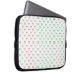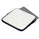 Laptop sleeve with a minimalist design featuring diagonal stripes in green, red, and blue on a white background. A laptop is partially visible, tucked inside.
