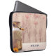Bolsa de laptop personalizada com design de país rústico. Uma lata velha de leite enferrujante com uma flor de laranja bonito. Trigo e papoilas vermelhas desbotadas no fundo colocadas sobre um painel de madeira esmaecido. Madeira é apenas uma imagem, não real.
