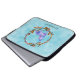 Uma bolsa de laptop com uma ilustração gráfica composta por um lobo de aquarela púrpura, numa pose clássica de uivar. Cercados por uma camada ilustrada de madeira, cristais, penas e miçangas. Legal motif nativo americano com estilo boho.
