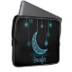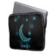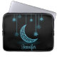 Esta bolsa de laptop bonita apresenta um fundo preto clássico com uma bonito lua azul brilhante e estrelas penduradas por cordas. Personalize com seu primeiro nome para uma ideia de presente especialmente personalizada. Perfeito para universitários ou de volta à escola.
