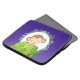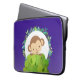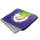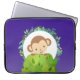 Bolsa de laptop com um desenho animado de um macaquinho espiando por trás de um arbusto verde. Cercada por uma coroa de folhas tropicais. Colocado sobre um fundo roxo.