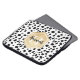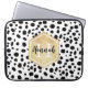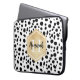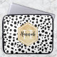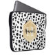 Na moda Dalmaciano mostra um padrão com uma etiqueta falsa de folha de ouro com nome personalizável e modelos monogramas. Uma bolsa de laptop com monogramas agudos com padrão de manchas pretas e brancas e elementos de ouro. Para alterar as cores da fonte e os estilos de fonte, clique no botão "personalizar" e clique no botão "personalizar mais".