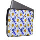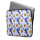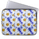 Bolsa de laptop em um padrão de aquarela de margaridas brancas com centros ouros amarelos, sobre fundo em tons de azul denim