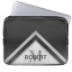 Esta bolsa de laptop moderna para homens apresenta um design geométrico com um nome e monograma personalizáveis num mármore branco e prata em fundo preto.
