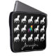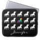 A bolsa de laptop preto e branco personalizada teste padrão do neopreno das meninas da silhueta do unicórnio. Um teste padrão bonito das silhuetas brancas do unicórnio no fundo preto. As cores vermelhas, alaranjadas, amarelas, verdes, azuis e roxas para o unicórnio center em uma aguarela do arco-íris projetam. Personalize esta caixa feita sob encomenda do laptop com nome na pia batismal bonita do roteiro debaixo dos unicórnios. Acessórios eletrônicos temáticos do unicórnio bonito para miúdos, adolescentes e meninas adolescentes.