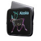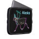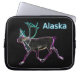 Uma renderização brilhante, semelhante a neon, de uma rena, também conhecida como rena. A leitura de texto "Alaska" também aparece em azul e branco brilhantes. Inspirado pelas luzes do Norte. Este design ganhou um prêmio do Melhor Dia.