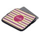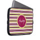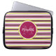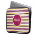 Esta bolsa de laptop feminina moderna apresenta um padrão listrado colorido em branco, amarelo, rosa e roxo com um nome personalizado e monograma em cores compatíveis.