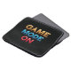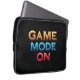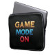 O design apresenta a frase "Game Mode On" em uma fonte ousada, sans- serif, renderizada em uma paleta vibrante de cores elegantes. As palavras estão dispostas em uma composição dinâmica, diagonal, criando um sentido de energia e entusiasmo.