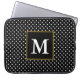 Um grande monograma branco é um quadrado preto com borda falsa de ouro. Bolinhas brancas estão nesta bolsa de laptop preta.