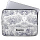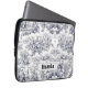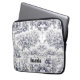 Elegante bolsa de laptop de monograma preto toile de jouy. Belo padrão perfeito de jouy Azul em fundo branco.impressões de Toile são uma fúria constante no momento, este é um elegante e ornamentado toile de jouy com cor damasco exótica, um estilo divertido que atualmente está se tornando atraente para decoração doméstica, roupas, móveis e Capas de ipad, convites e muito mais. O design é clássico e eterno com uma cor espantosa. Você pode alterar todas as cores e fontes do texto, clicar para personalizar ainda mais abaixo da área de personalização do texto que o levará à ferramenta design. Um presente feminino único para aniversário, feriados e qualquer ocasião especial. Seja para dia de os namorados, Natal ou como um presente em geral, faz uma ideia de presente excelente