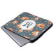 Bolsa de laptop personalizada com um padrão feito com raposas de laranja bonitinhas e felizes. Fundo verde escuro. Pequenos cogumelos e folhas espalhados. Um círculo branco colocado sobre o topo com seu nome e dentro inicial monograma.