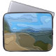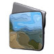 Um design brilhante e colorido abstrato de uma vista de montanha, com céu azul, rocha e árvores.