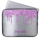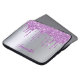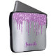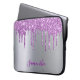 Uma mala elegante, feminina e gampa. Colírio de falso roxo, pingar de tinta. Fundo metálico de aparência fina prateada. Insira seu nome, escrito com um script de estilo moderno, escrito à mão. Letras cor púrpura.