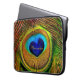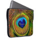 Uma bolsa de laptop 15 polegadas com uma fotografia impressionante do close up de um coração vibrante e bonito deu forma aos olhos azuis de uma pena de pássaro lindo do pavão de turquesa e de ouro. Personalize adicionando seu nome. Aperfeiçoe a maneira para que os amantes do pássaro digam: Eu amo pavões!