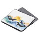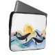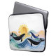 Adicione o tema marinho baleeiro para animar seus acessórios de laptop com nossa colorida bolsa de laptop Boho Blue Ocean & Happy Whales, com três baleias brincalhonas a piscar em um mar sereno sob um sol ouro. O design é capturado em tons de azul, lacre, amarelo, ouro, rosa e roxo.