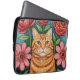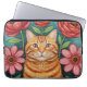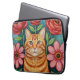 Laptop sleeve with a cute orange cat with folk art red and pink flowers.