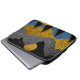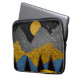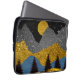 design de paisagem da montanha abstrato em tons de ouro, preto e azul em tons negros, com um luar e pássaros.