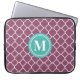 Um padrão de fundo de latência marroquina de ameixa quatrefoil roxa, de tendências, na moda, girly plum roxa com um quadro azul-aqua e branco para sua letra inicial de monograma personalizado.