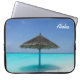 Bolsa de laptop com uma fotografia de uma praia de caribe tropical cênica. Uma praia branca arenosa e águas azuis cristais com um guarda-chuva compacto a solo. Secudido e sereno.