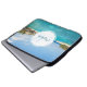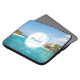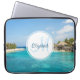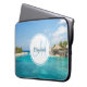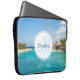 Uma bolsa de laptop com uma bela foto com um resort de praia tropical. Bonito água azul e praia branca arenosa com aqueles cabanas que lhe dão uma vibração tranquila na ilha. Um círculo branco colocado sobre o topo com seu nome e dentro inicial monograma.