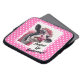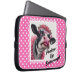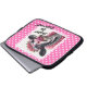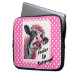 Uma manga branca e divertida de laptop/tablet com fundo polca rosa e branco pontilhado, uma vaca preta e branca vestida vestindo óculos rosa, vestido rosa e pérolas. O cadarço ao redor da vaca e o ditado, Pucker Up ButterCup! no canto.