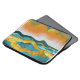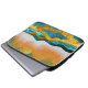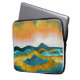 Cena de paisagem abstrato de uma zona de montanha com colinas rolantes e uma tempestade de chuva em laranja, ouro, azul e ciano.