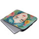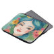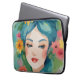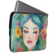 Este design vibrante e caprichoso apresenta um retrato abstrato de uma mulher com cabelo azul lacrimejado com flores coloridas. Sua expressão serena é acentuada por olhos fechados e lábios vermelhos, dando a ela uma aparência de sonho. Ao redor dela estão girassóis vibrantes, flores cor-de-rosa, e uma variedade de folhagem verde, criando uma atmosfera exuberante, semelhante a jardim. A peça tem um estilo de interface suave e vetorial, dando-lhe um sentimento moderno, mas romântico. A paleta de cores é dominada por chaleiras, amarelos, pinças e verdes, criando uma composição harmoniosa e atraente para os olhos.
